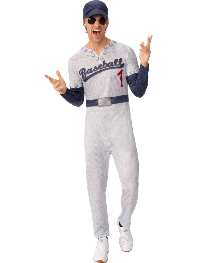 Dress up like a champ with Rubies Baseball Superstar. Featuring a printed jumpsuit and dark blue cap to get your head in the game. Pair with our Rock Star Sunglasses to truly radiate superstardom. Perfect for Halloween or sports-themed events, it's time to step up to the plate and show off your winning style!