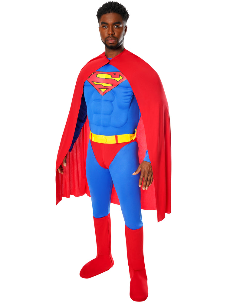 Clark Kent, the mild-mannered Journalist for the daily paper "The Metropolis" changes into the famous DC Comics superhero Superman, whenever danger prevails. Swapping the glasses for a cape, he takes on the villains of his town, like Lex Luther. Born Kal-El from the planet Krypton he boasts super-natural abilities including strength, speed, hearing, the ability to fly and X-Ray vision. While stealthily trying to maintain his cover as a reporter, Clark has a deep love interest in his colleague Lois Lane, the only person to learn of his true identity. Superman has appeared in many DC Comic books, TV series and movies. Warner Bros blockbuster movies include Superman (1978) played by Christopher Reeve, Superman Returns (2006), Man Of Steel (2013) starring Henry Caville, Batman Vs Superman: Dawn of Justice (2016) and Justice League (2017). He is the ultimate superhero! Includes jumpsuit with moulded EVA muscle chest and printed Superman logo on chest plus full-length sleeves with fibre filled muscles, trousers with sewn in briefs and attached 3D boot tops, foam belt with print and ties at back and detached cape in polyester.