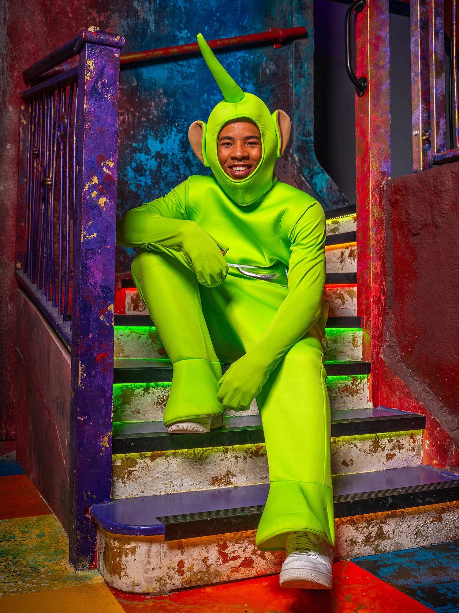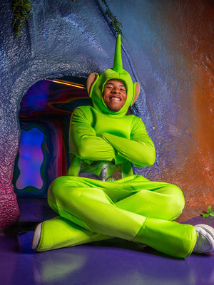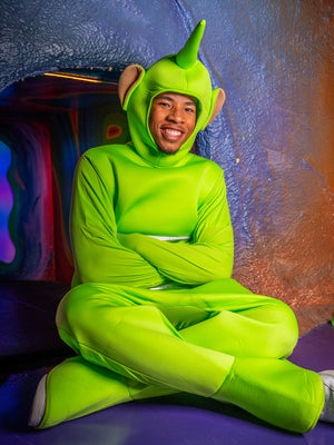 Straight from Tellytubby Land, this cute little green character is from the UK TV series The Teletubbies, where Laa-Laa and his four colourful friends Laa-Laa, Po and Tinky-Winky, speak gibberish and dance around watching television screens on their stomachs! With an antenna that looks like a dipstick, become Dipsy and listen for the large pin-wheel shaped windmill, indicating that a magical event is about to begin!