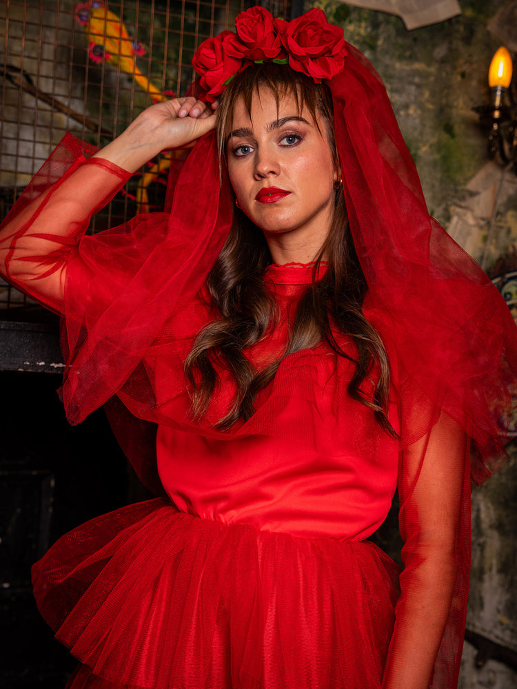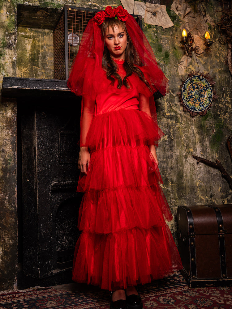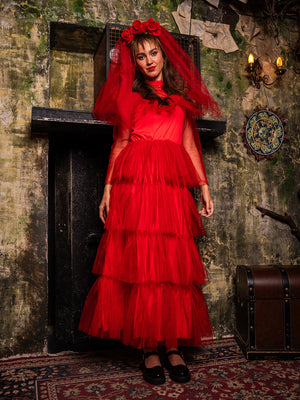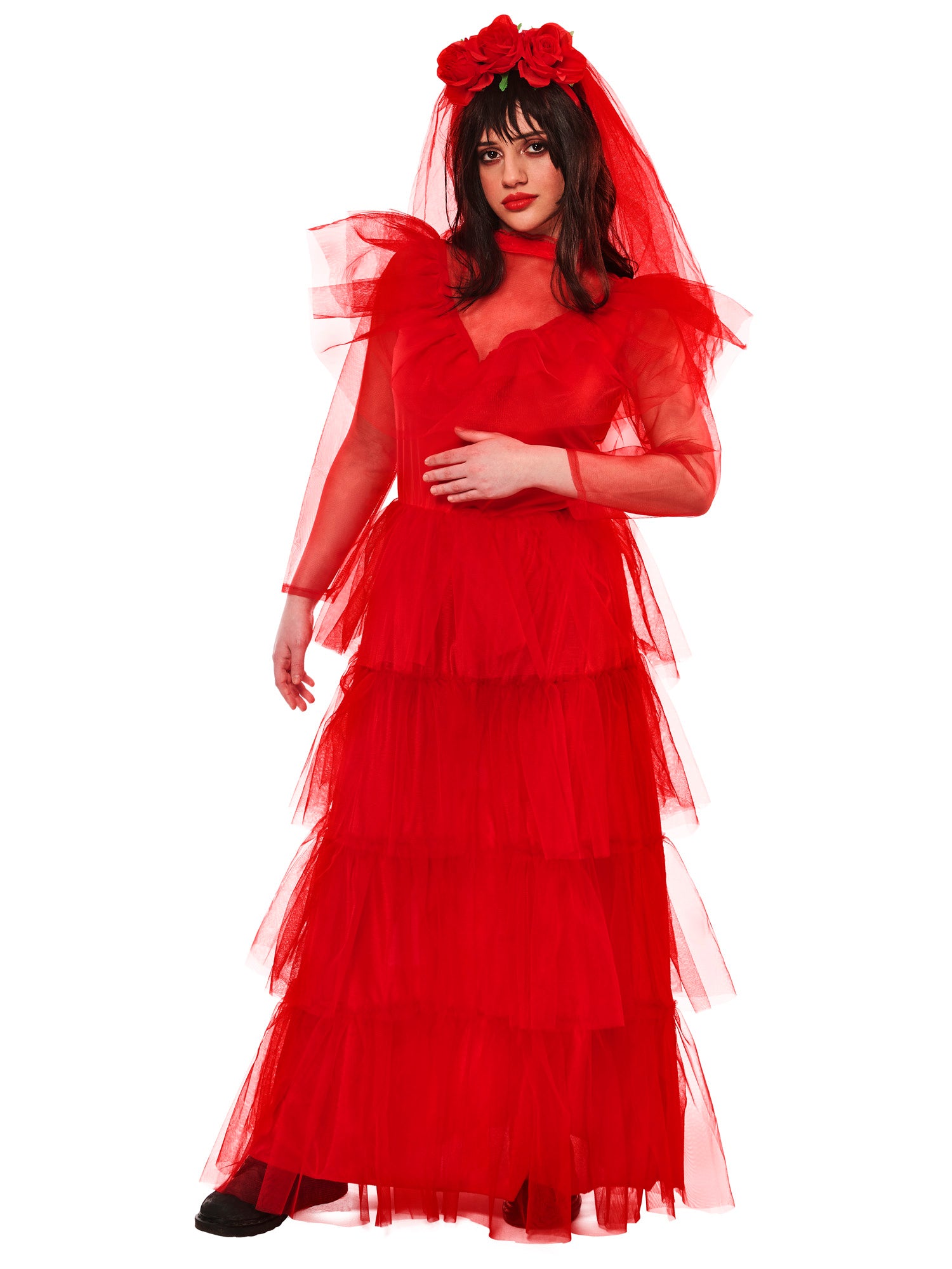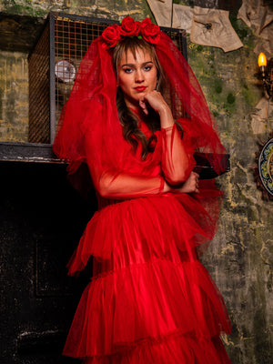 Unleash your inner goth glam with the Lydia Costume from Rubies! This hauntingly beautiful outfit captures the essence of Beetlejuice's iconic character with its red dress and headband. Get ready to spook and strut through every Halloween haunt and cosplay convention!
