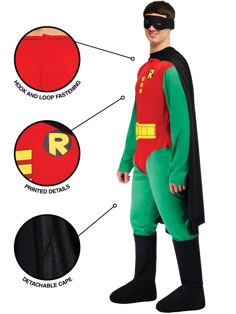 Jumpsuit with boot tops, belt, cape and eye mask