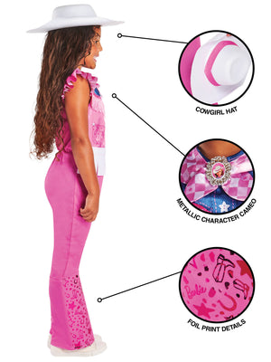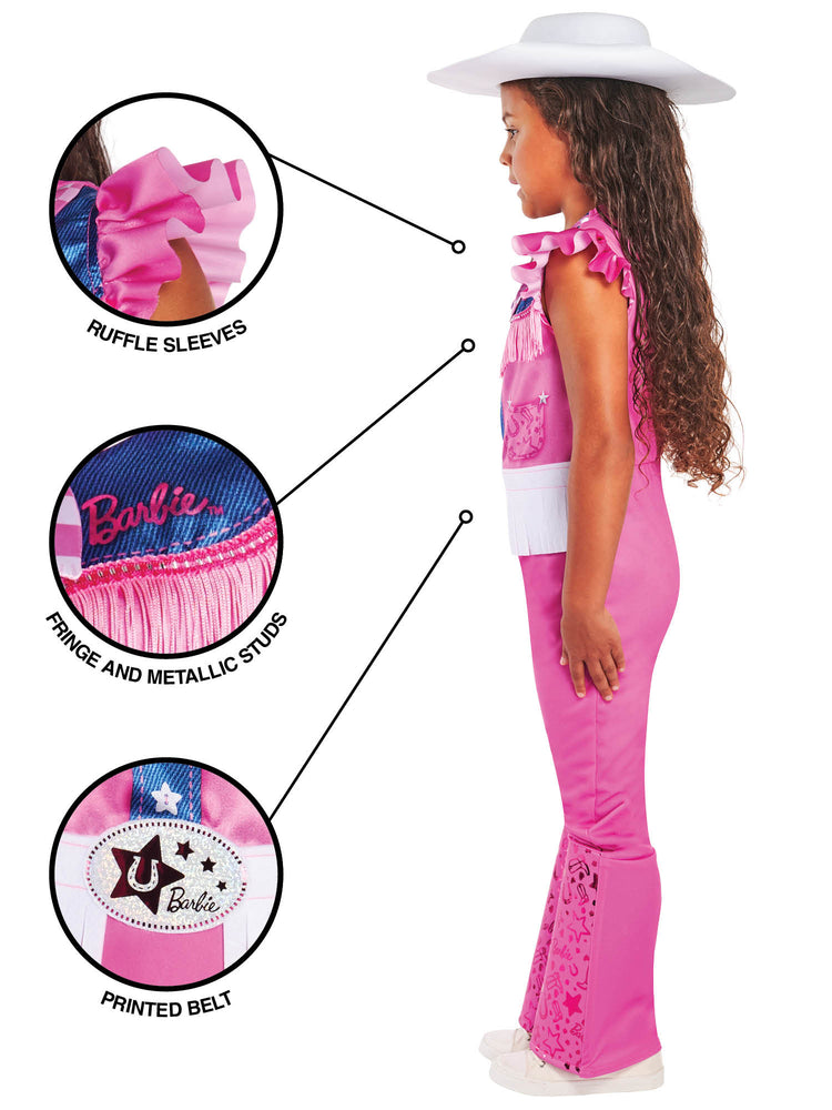 Let your child's imagination ride off into the sunset with the Barbie Cowgirl Child Costume. This adorable costume includes a comfortable jumpsuit, a stylish cowgirl hat, and a cute necktie accessory.
