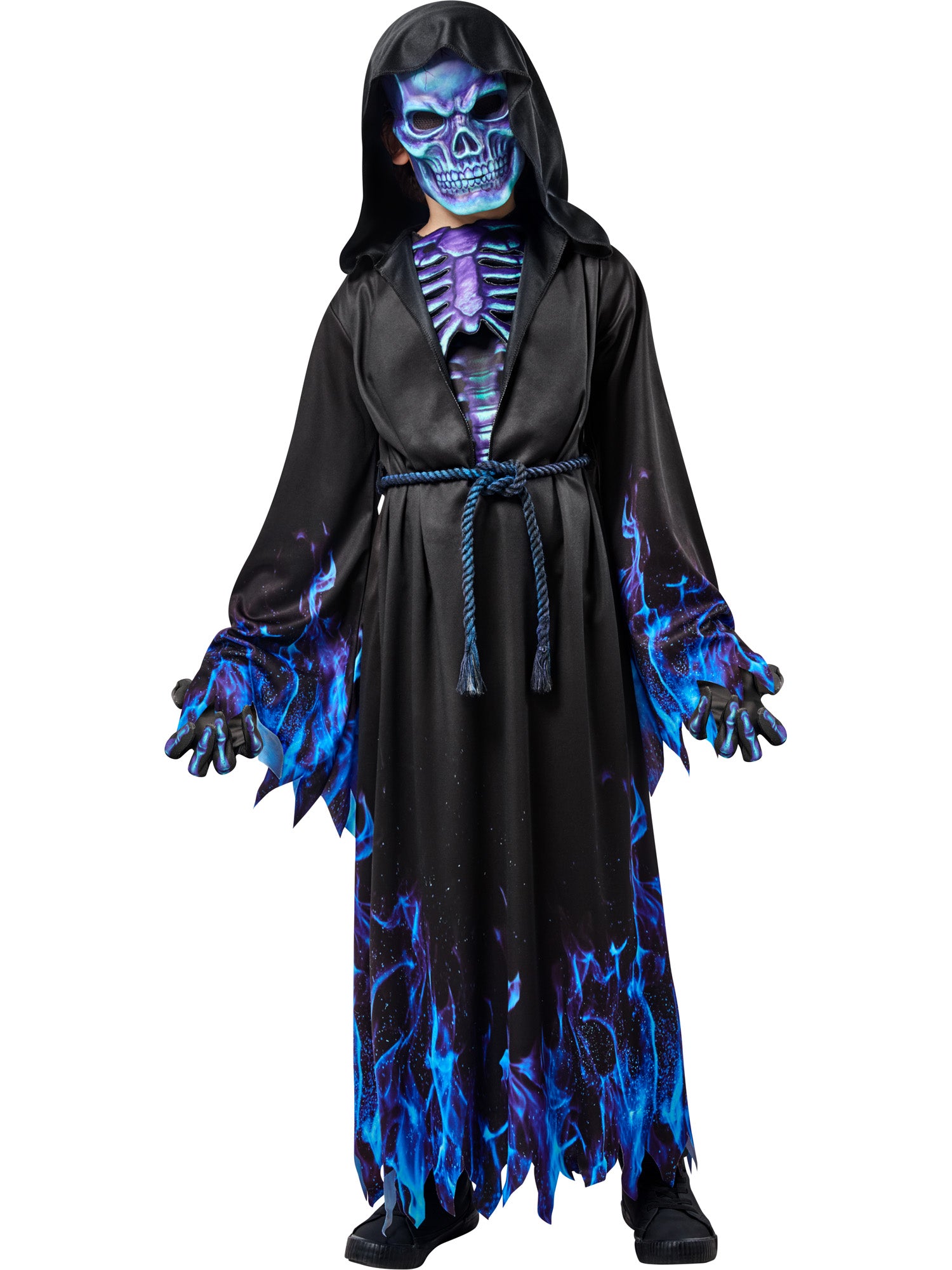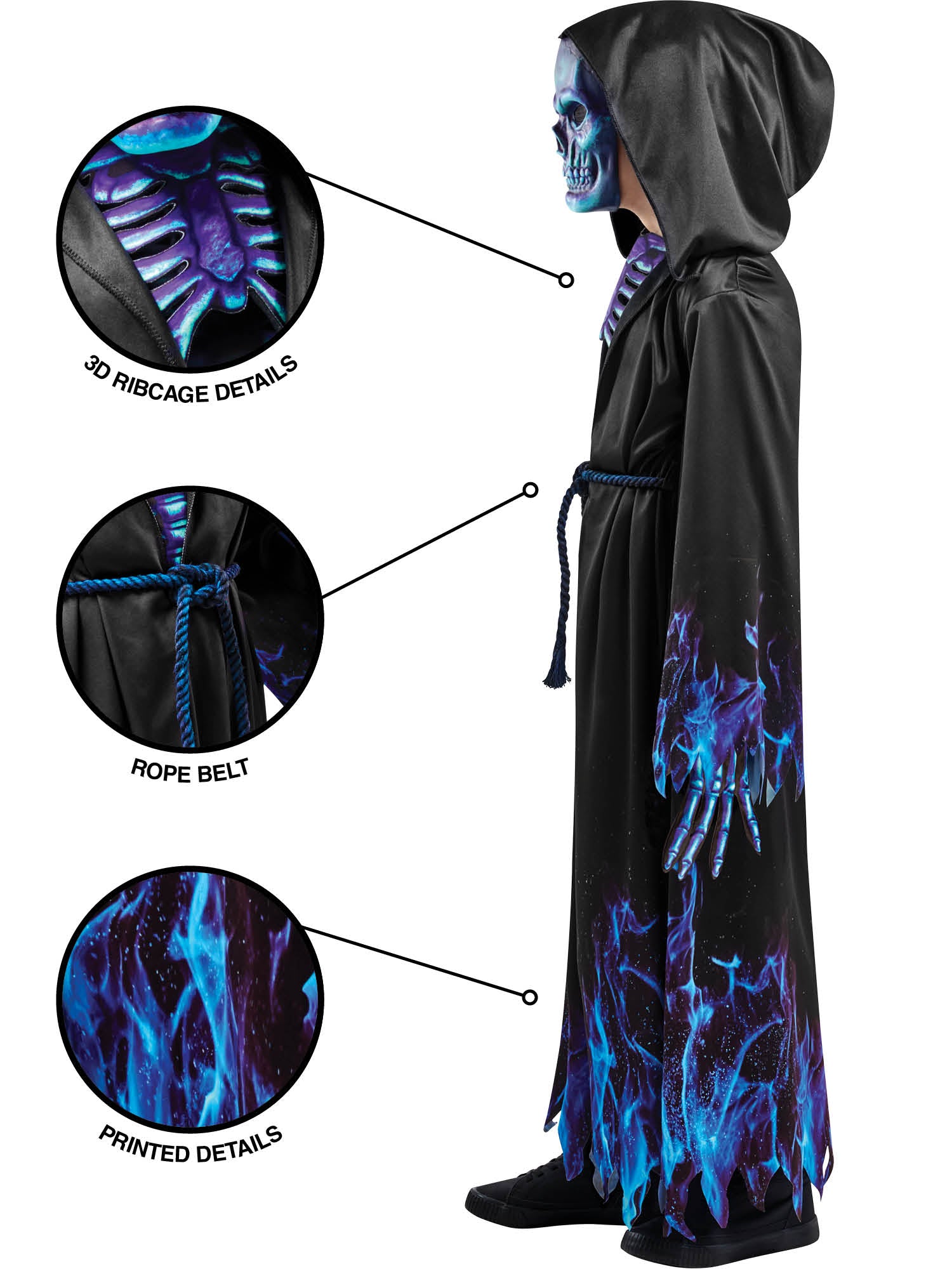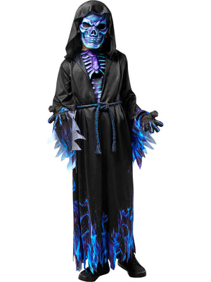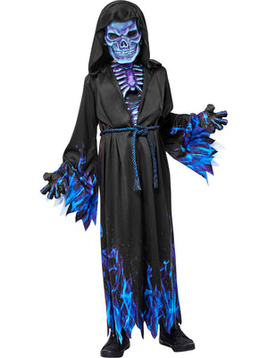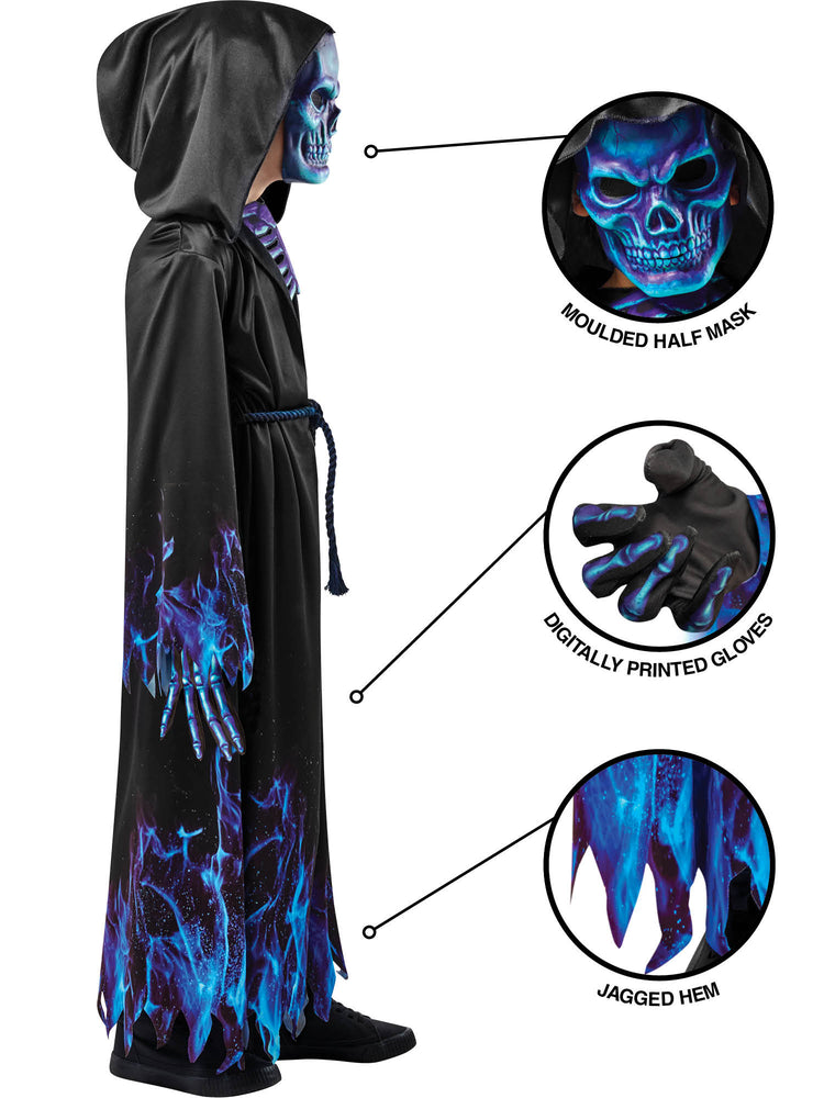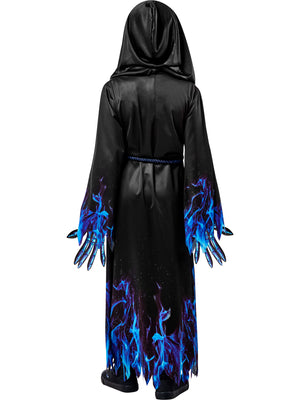 The robe features a deep blue color scheme with intricate detailing, while the mask adds a touch of mystery and fear to the look. The belt cinches in at the waist to create a flattering silhouette, making it perfect for Halloween, costume parties, or any other occasion where you want to scare your friends.