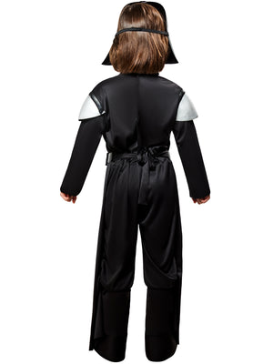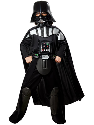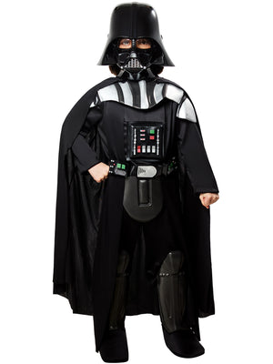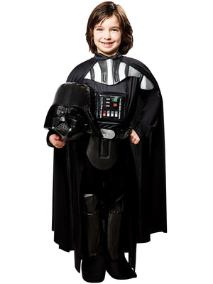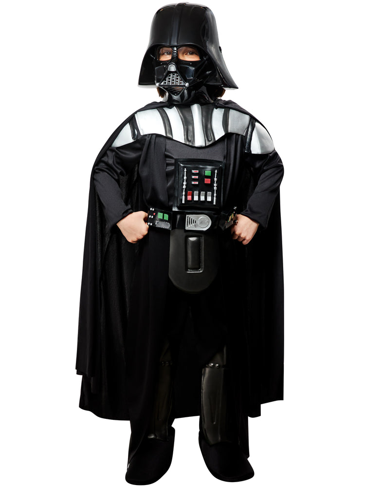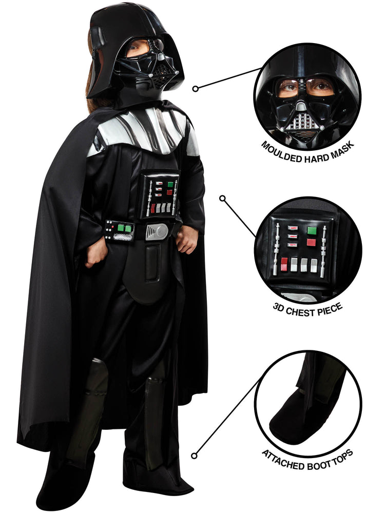 Ultimate villain of the original trilogy, Darth Vader was born Anakin Skywalker, a Jedi lured to the dark side by Palpatine. This iconic Lucas Film and Disney anti-hero of the Star Wars series, Darth is father to Luke and Leia and characterised by his black robes, cape, helmet and breathing device. Become the reigning Sith Lord of the Galactic Empire today - and may the force be with you. Includes Jumpsuit in polyester with attached computerised control panel with print, EVA collar with print, full length sleeves and attached 3D boot tops with shin guards and sewn in cod piece 3D belt with painted features and fasten at back Long cape in polyester with chain fasten at neck Moulded mask with clear eye covers and elastic strap with hook and eye closure fasten. Lightsaber and gloves not included This is an officially licensed Star Wars product