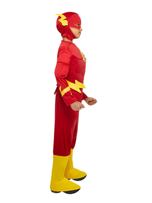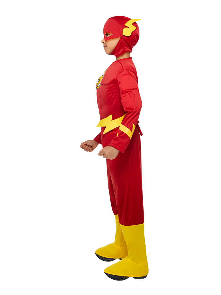 Run at near light-speed like scientist-turned-Super-hero Barry Allen, best known to all DC Comics fans as The Flash! Don the mask and wrap your zig-zag yellow belt around the bright red jumpsuit! The muscled chest bears his lightning streak, symbol of the Crimson Comet's supersonic speed!