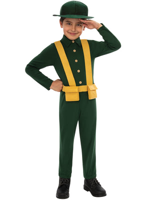 Green button effect costume with yellow braces, belt with pouch detail and hat