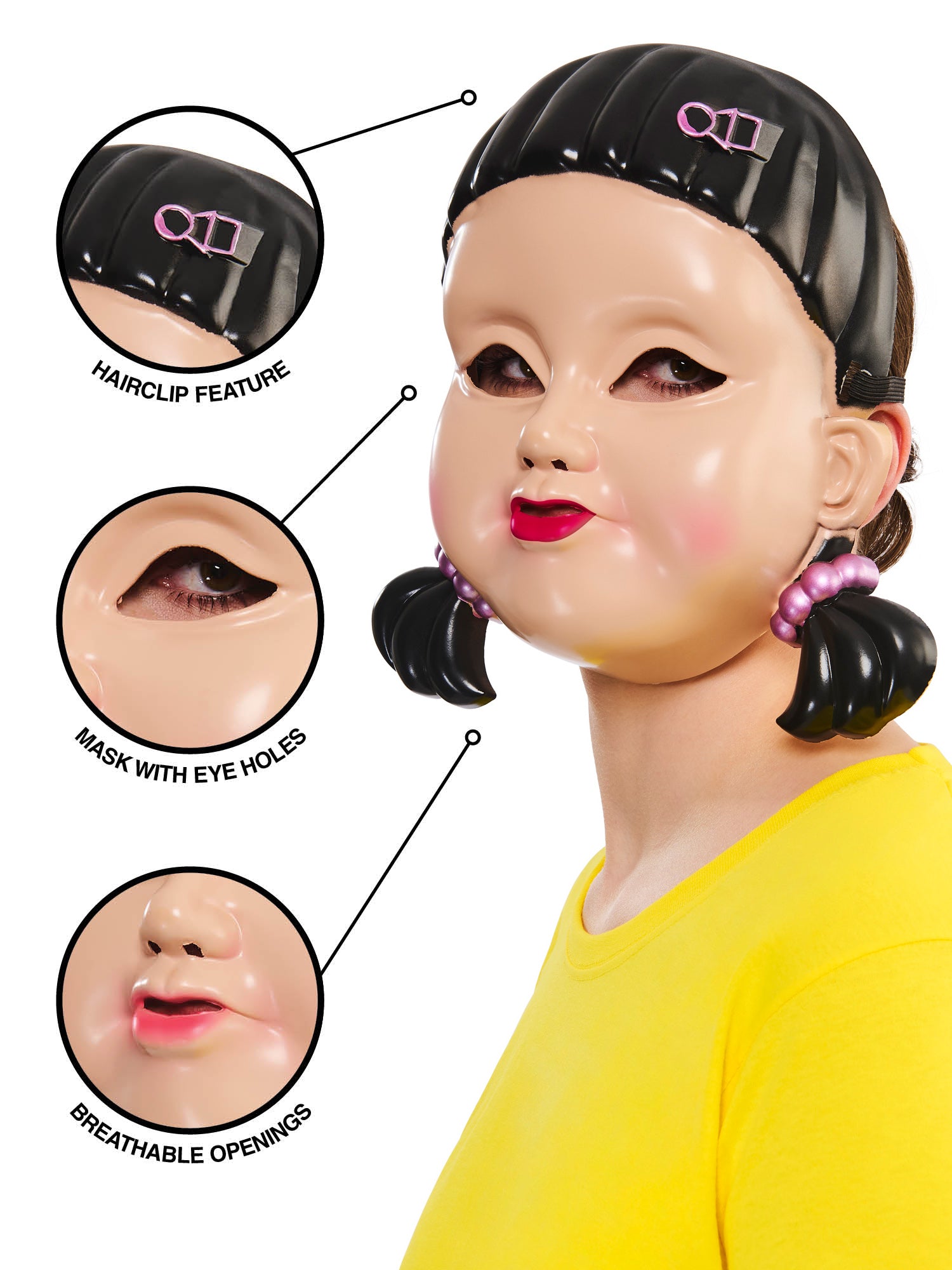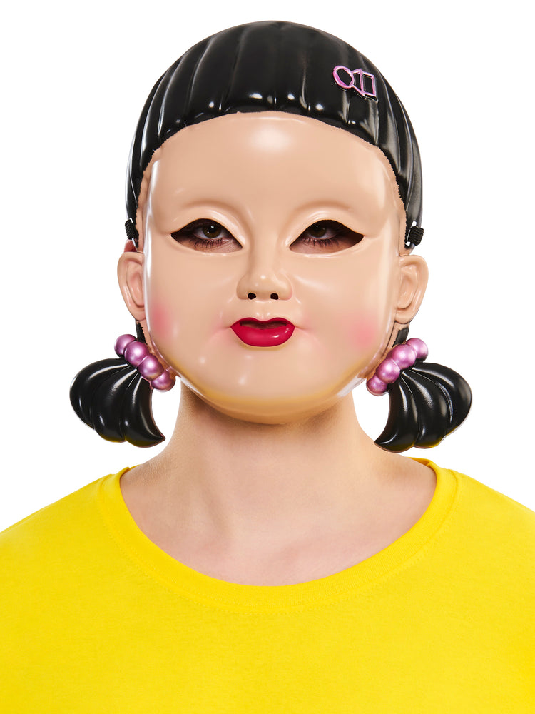 Transform into a haunting enigma with this moulded half mask that captures the eerie allure of Squid Game's Girl Doll. Team it with a costume to get your Halloween look!