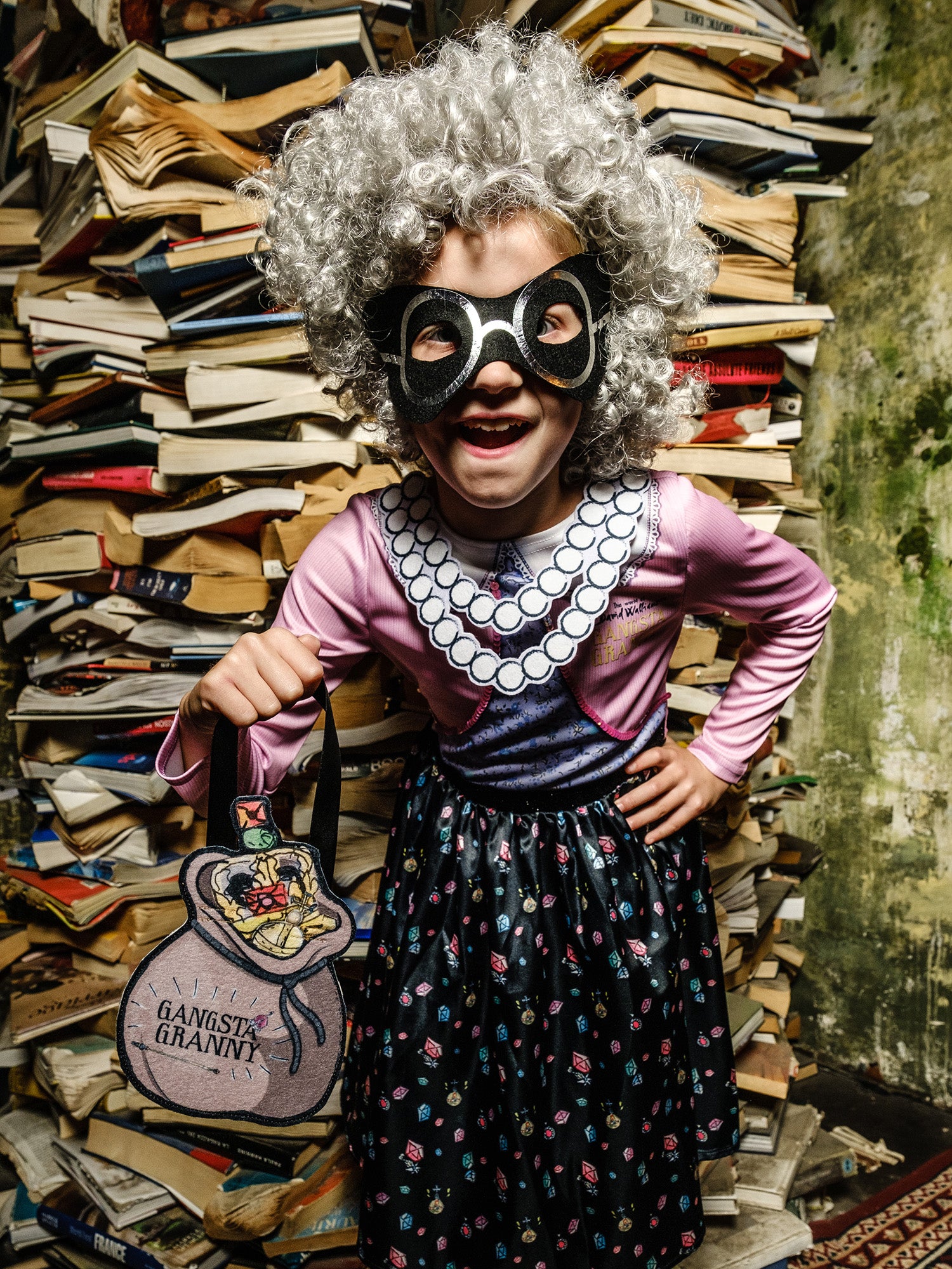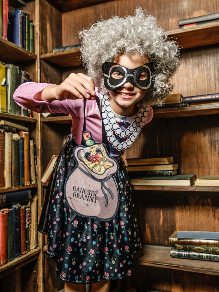 Get ready for a comedic caper with the Rubies Gangsta Granny costume! This hilarious outfit features a dress with a faux cardigan, a wig, a mask, and an accessory bag, perfect for transforming into the iconic character from David Walliams' book. Let your child bring the mischief and laughs to any occasion with this riotously fun costume, ideal for Book Day!