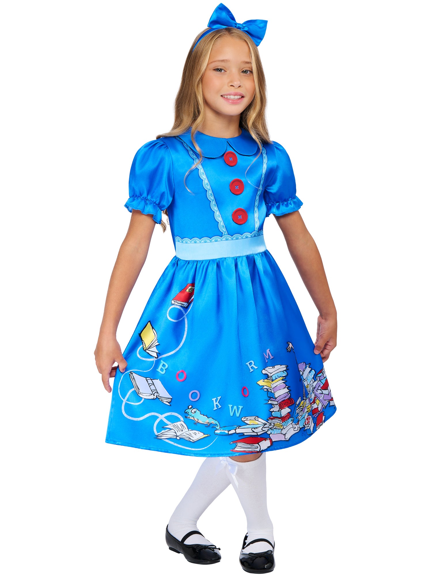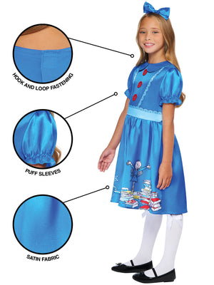 Dress, headband, book bag and quill accessory with printed cut-out bookmark