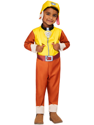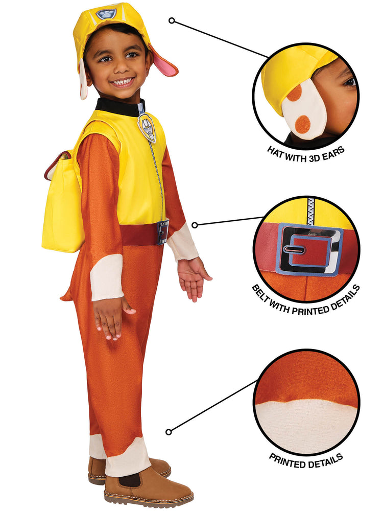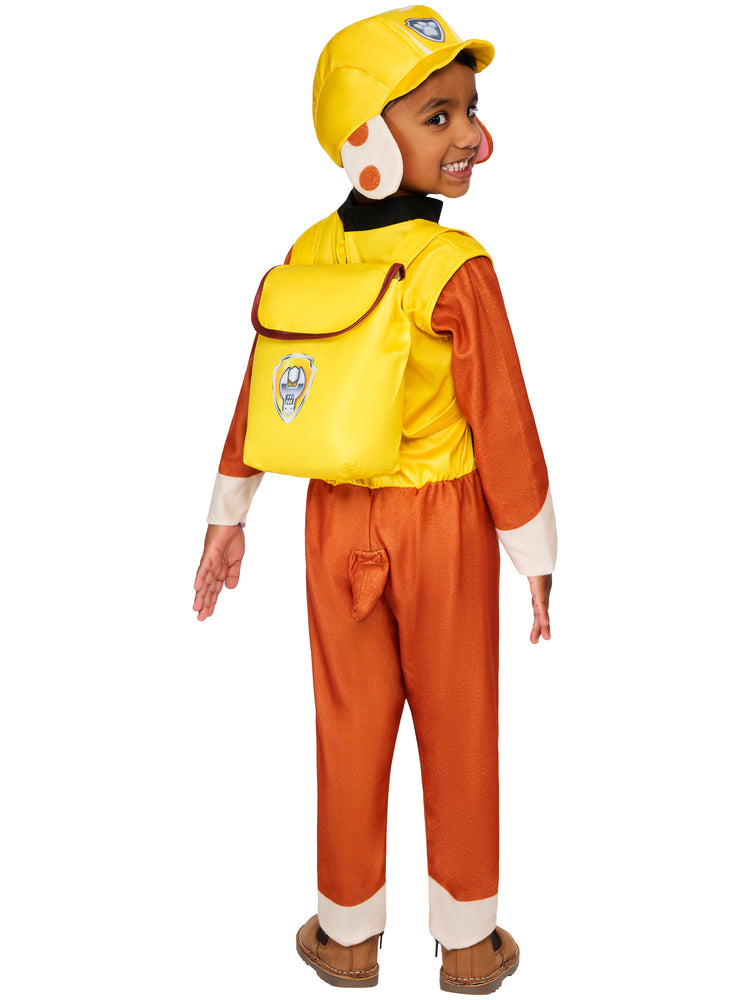Enter the Adventure Bay in style with the Rubble costume from Paw Patrol by Rubies! This officially licensed costume includes a jumpsuit featuring Rubble's signature construction vest, a backpack for all your missions, and a hat with adorable puppy ears. Perfect for young fans looking to save the day in paw-some fashion!