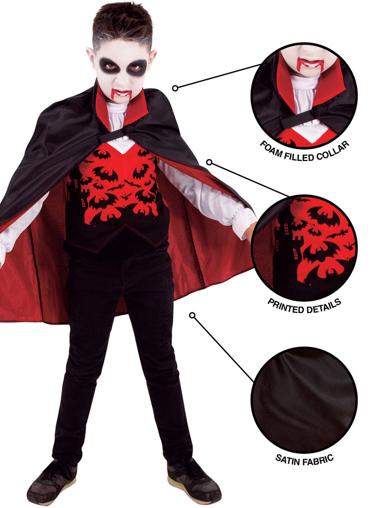 Unleash the fangs with this captivating cape, printed shirt, and jabot ensemble! From the regal cape to the hauntingly handsome accessories, every detail immerses you in the classic vampire lore. Become the epitome of the famed creatures of the night with this tribute to the undead.