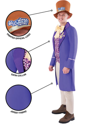Embrace the charm of Willy Wonka with this captivating coat and hat ensemble. Every detail invites you to revel in the whimsical, larger-than-life magic of this iconic character.