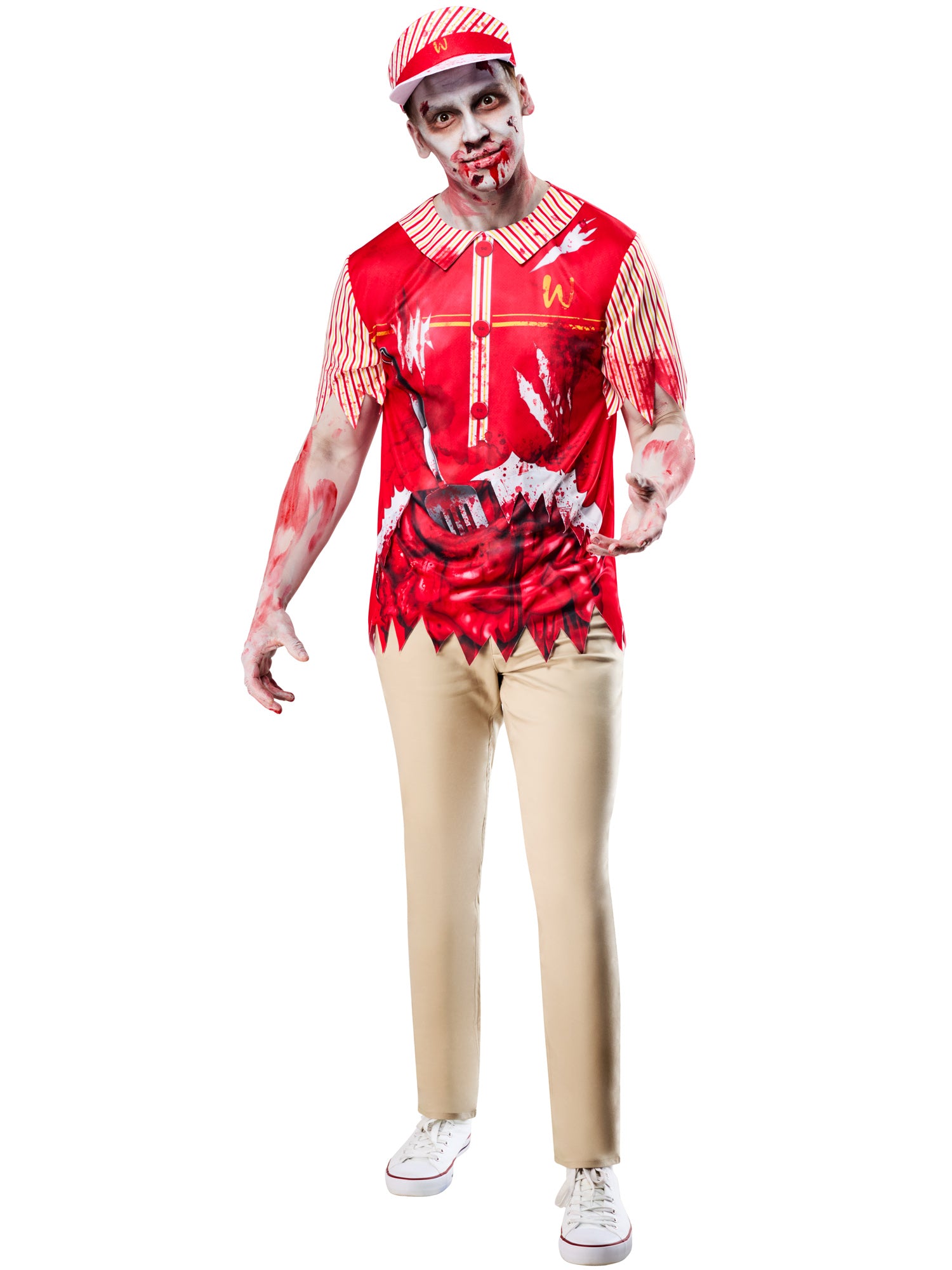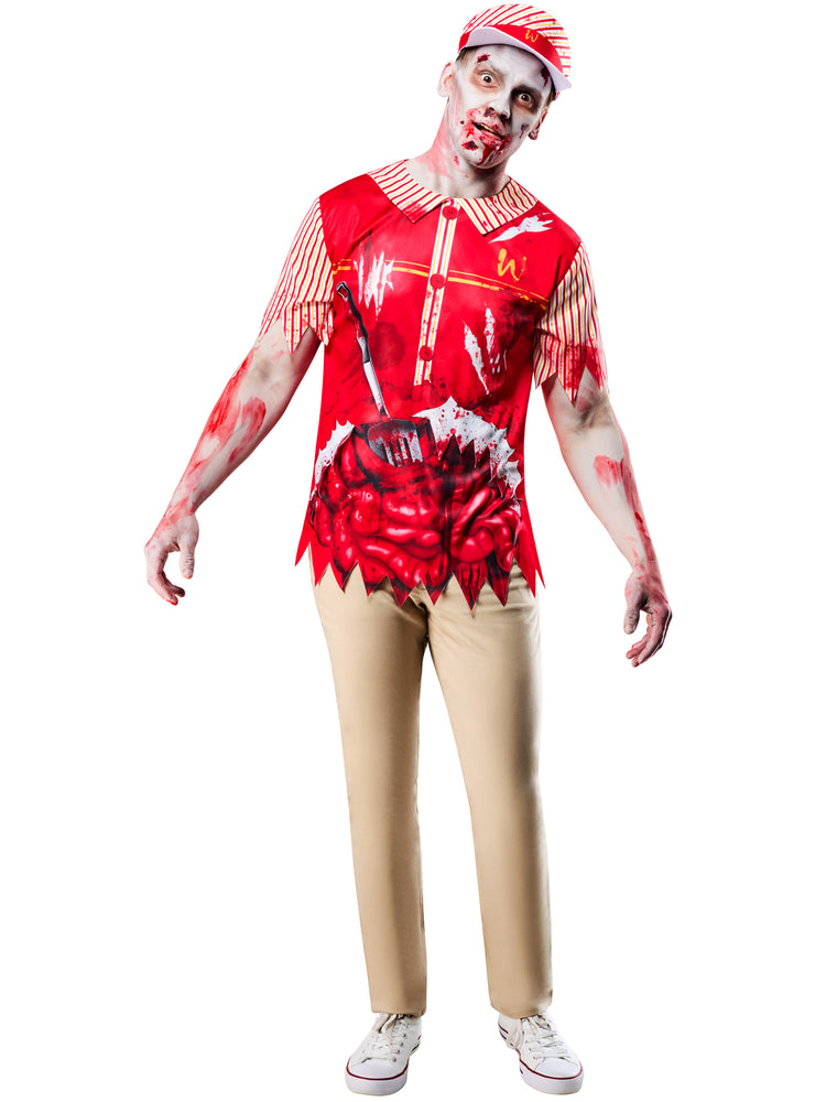 Dish out some deliciously terrifying fun with this Zombie Burger Worker Adult costume! Serve up screams instead of fries as you shuffle through your shift from beyond the grave. Perfect for fast food veterans with a twisted sense of humor or Halloween party-goers looking to add some corporate horror to their outfit. Would you like brains with that?