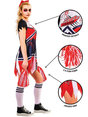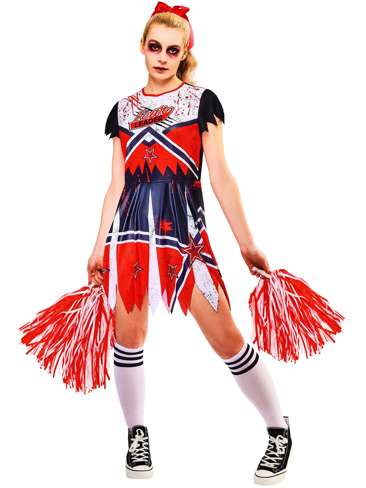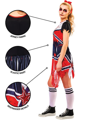 Bring some undead spirit to the game with this ghoulishly fun Adult Zombie Cheerleader costume! Cheer for brains instead of touchdowns as you shuffle and moan your way through parties and Halloween events. Perfect for horror enthusiasts and anyone looking to add a twisted touch to the classic cheerleader look. Get ready to raise some hell – and some pom poms!